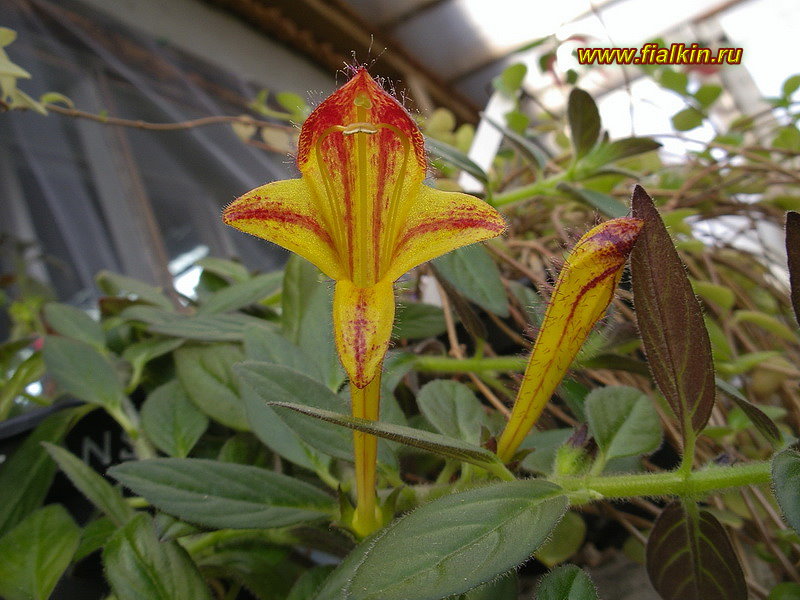 Ампельное растение с яркими жёлтыми цветками и красным напылением в виде полос по центру лепестков. Средне-зелёные продолговатые блестящие листья около 4 см длиной.