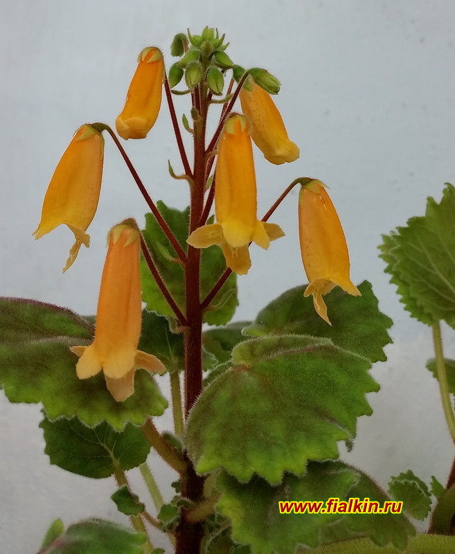 Ярко-жёлтые цветы с оранжевым оттенком, горлышко и зев жёлто-кремовый с жёлто-оранжевыми точками и каймой по краю лепестков. Листья бархатистые тёмно-зелёные с бордово-малиновыми прожилками.