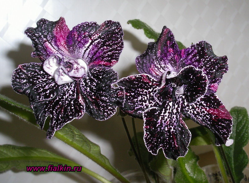 Крупные, около 7 см, махровые и полумахровые цветки с волнистыми краями лепестков чернильно-фиолетового цвета с красно-малиновыми полосами фэнтази. По всем лепесткам белый крап. Цветки не выгорают и долго держатся.